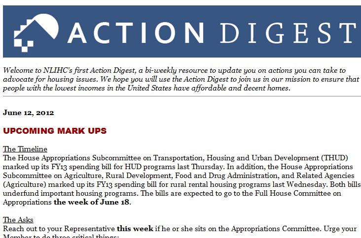 Action Digest helps supporters see the whole picture of housing advocacy, from upcoming mark ups to pending bills to opportunities to thank lawmakers for advancing good low income housing policy. The first edition of the Digest received lots of praise from our members. We hope you’ll sign up to receive the Action Digest and our other emails, and let us know what you think of this new resource.