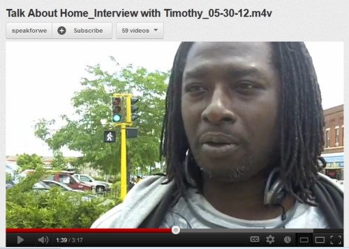As part of his “Talk About Home” project, Michael has been interviewing a wide range of pedestrians walking around the Twin Cities about the meaning of home and their response to the extreme levels of homelessness in their state. Videos of the interviews are posted on his website, which he hopes help make affordable housing and ending homelessness major issues during the 2012 election.
