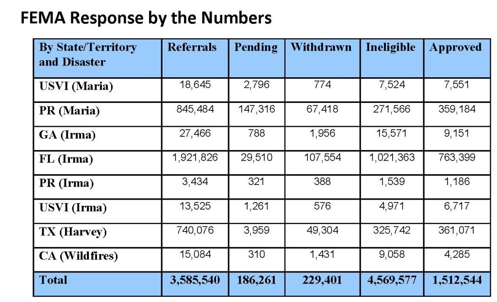 Below is a table provided by FEMA with the number of individuals who applied for assistance and the status of their applications, including the number of people denied assistance and the reasons for denial, by state. For more detail, go to: http://bit.ly/2BAejnc