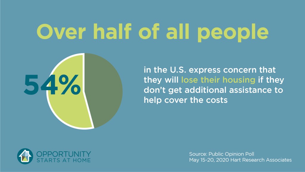 A robust stimulus package is required and, among many other important investments, must include resources to ensure housing stability, particularly as eviction bans are lifting across the country. As explained in NLIHC’s new Out of Reach report, even before COVID-19 and the associated economic shocks, housing costs were too high for people with low incomes. Prior to the pandemic, 7.7 million extremely low-income renter households were spending over half their incomes on housing, and they are now at the highest risk of losing their homes. About half of the lowest-income households have reported recent job or income losses, especially workers in hospitality, food services, retail, and personal services.