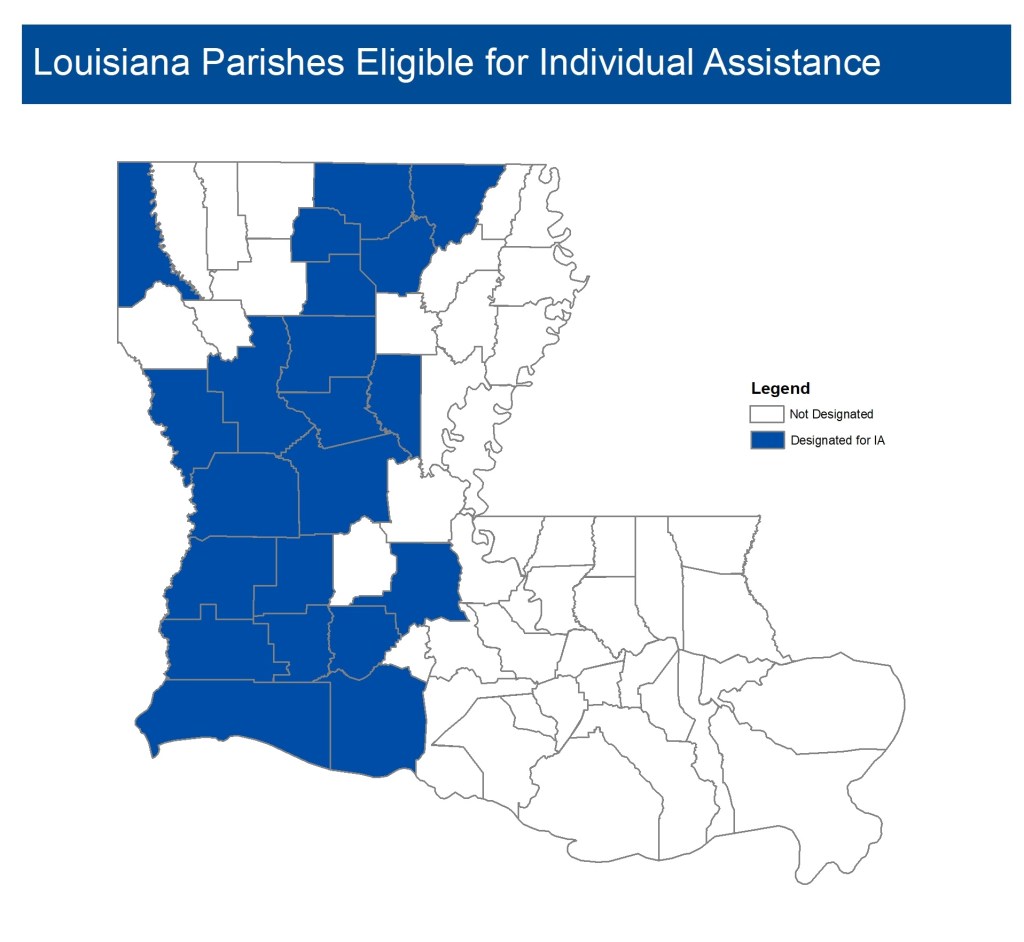 FEMA designated 21 parishes throughout Louisiana for Individual Assistance (IA). Individual Assistance includes the Individuals and Households Program (IHP), which provides approved registrants with rental assistance; home repair assistance for homeowners; or assistance for other disaster-related needs like childcare, medical care, transportation, storage, or replacement of essential household items. These parishes are likely the most severely impacted by the storm.