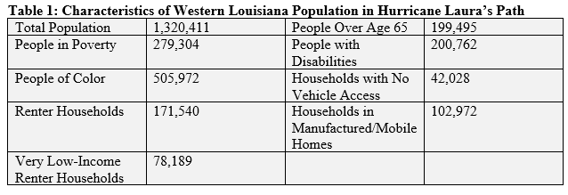 Many people in these Louisiana parishes—which are home to more than 1.3 million residents—will struggle to recover from Laura. According to the American Community Survey, the poverty rate of 21% for these parishes is significantly higher than the national rate of 14%. Over 199,000 people are over age 65, and over 200,000 have disabilities. These residents are likelier to have mobility issues and special housing needs, and disruptions to utilities and normal social services can have a larger impact on their health. Nearly 506,000 residents are people of color. Minority populations are more vulnerable at all stages of disaster, due to historic and ongoing structural racism, social and economic marginalization, and underinvestment in majority-minority neighborhoods. Nearly 103,000 households live in manufactured or mobile homes, which are often more vulnerable to storm damage. Over 42,000 households lack access to a vehicle, which can make it difficult to reach Disaster Recovery Centers.